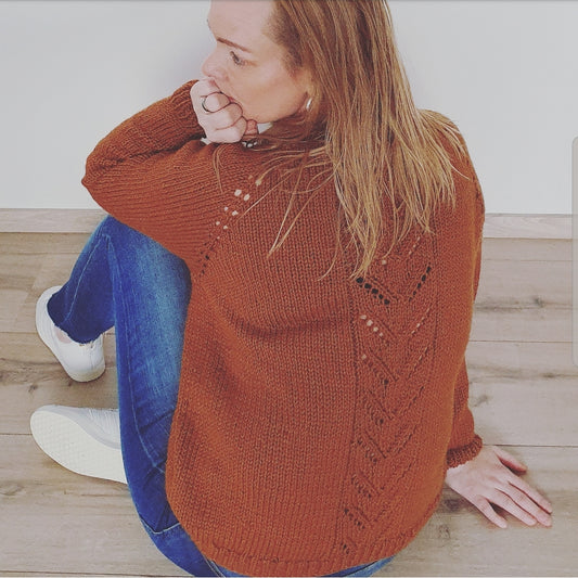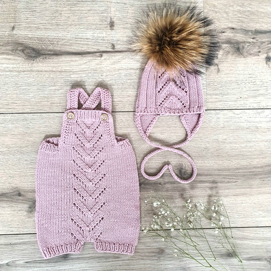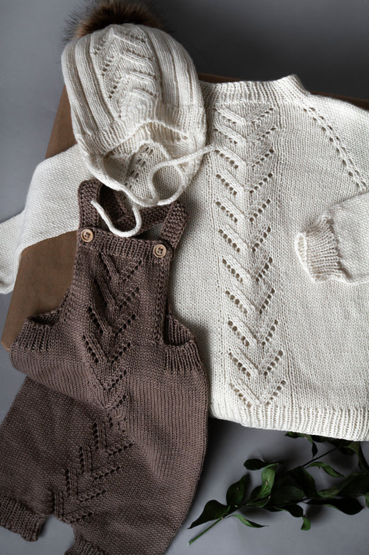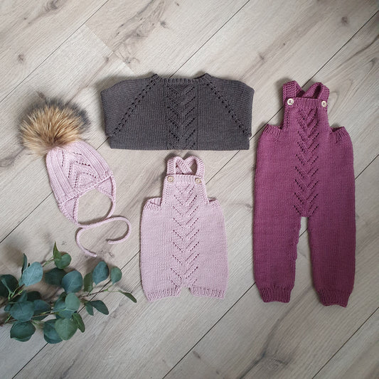 Die Kollektion "VÖK" besteht aus Strickmustern für einen Damenpullover und eine Kinderjacke mit Lochmuster im Rücken und in den Raglanschrägen, und eine Mütze und eine Latzhose für Kinder und Babys mit demselben Lochmuster vorne. Pullover und Jacke werden als Raglan von oben gestrickt.