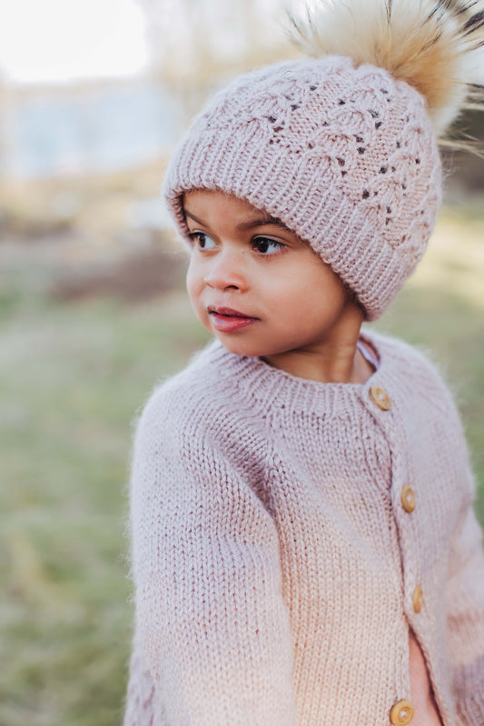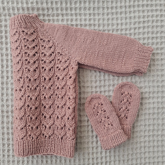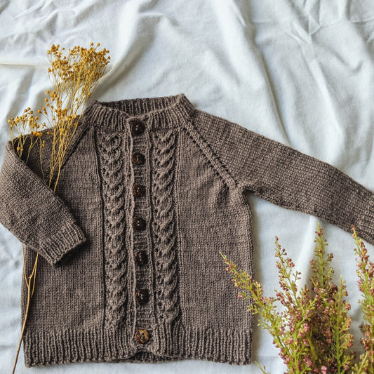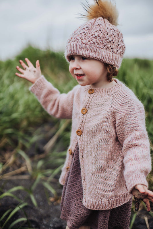 Für die größeren Geschwister gibt es auch die Jacke "Rabe" mit demselben Lochmuster aus etwas dickerer Wolle!