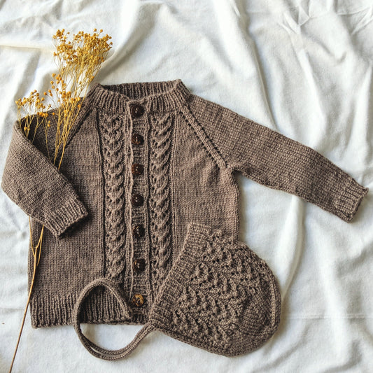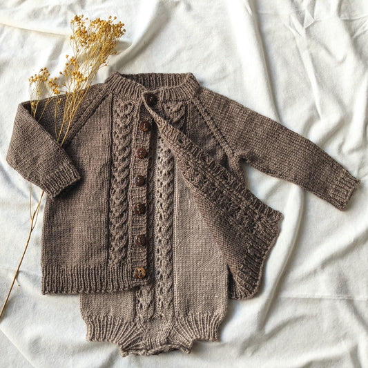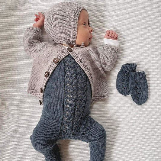 Willkommen Daheim besteht Jacke, Romper, Häubchen, Handschuhe und Socken.