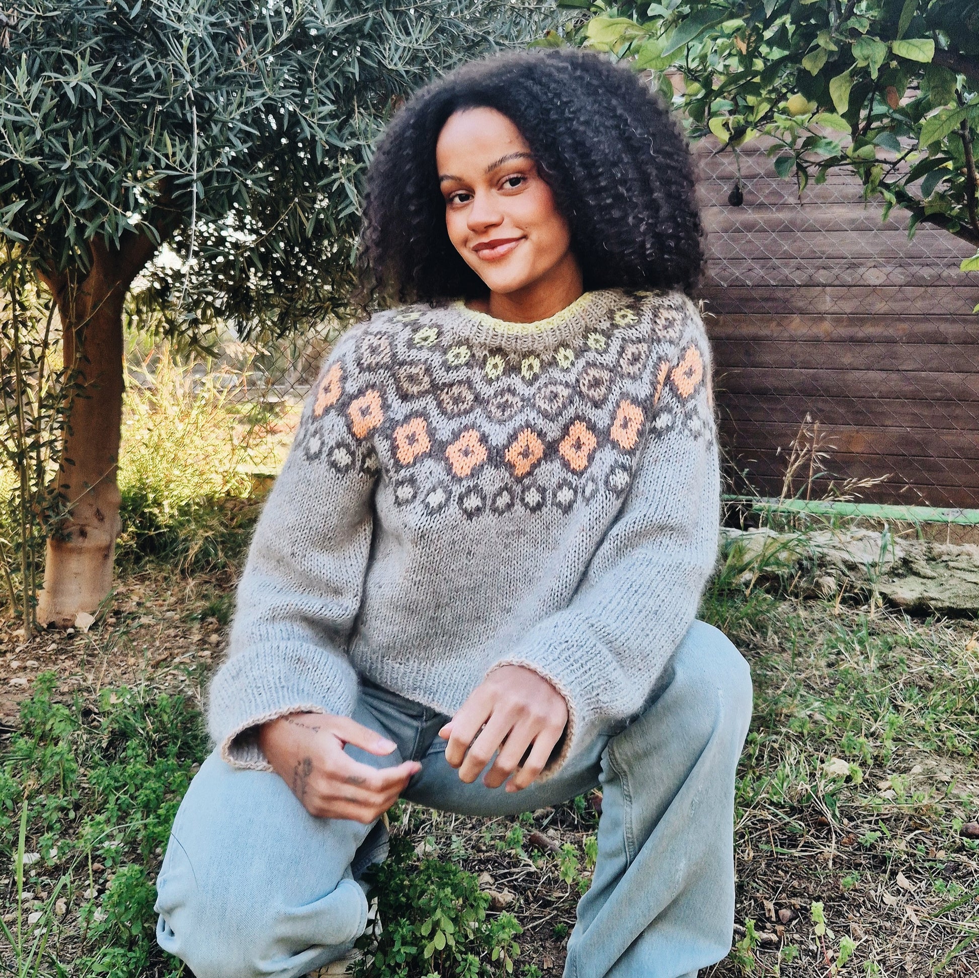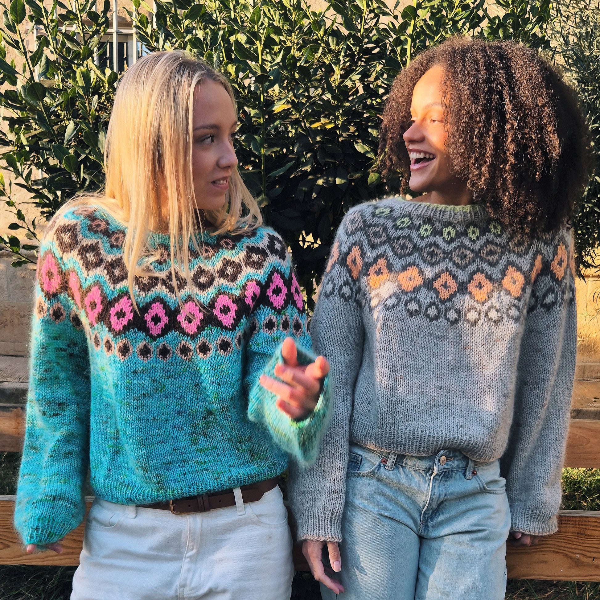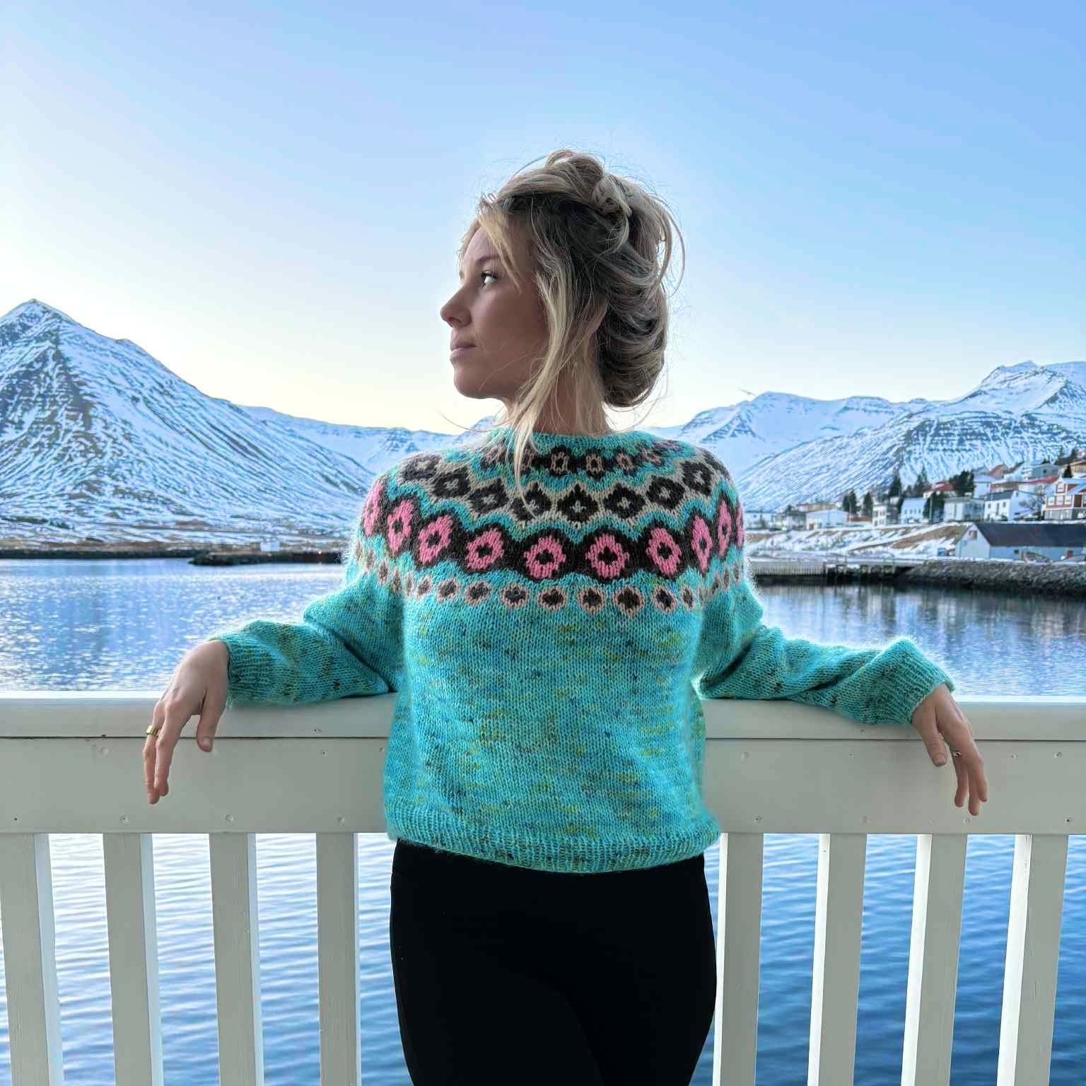 Irma ist ein leichter und farbenfroher Pullover, von oben nach unten mit eingestrickter Musterpasse gearbeitet.