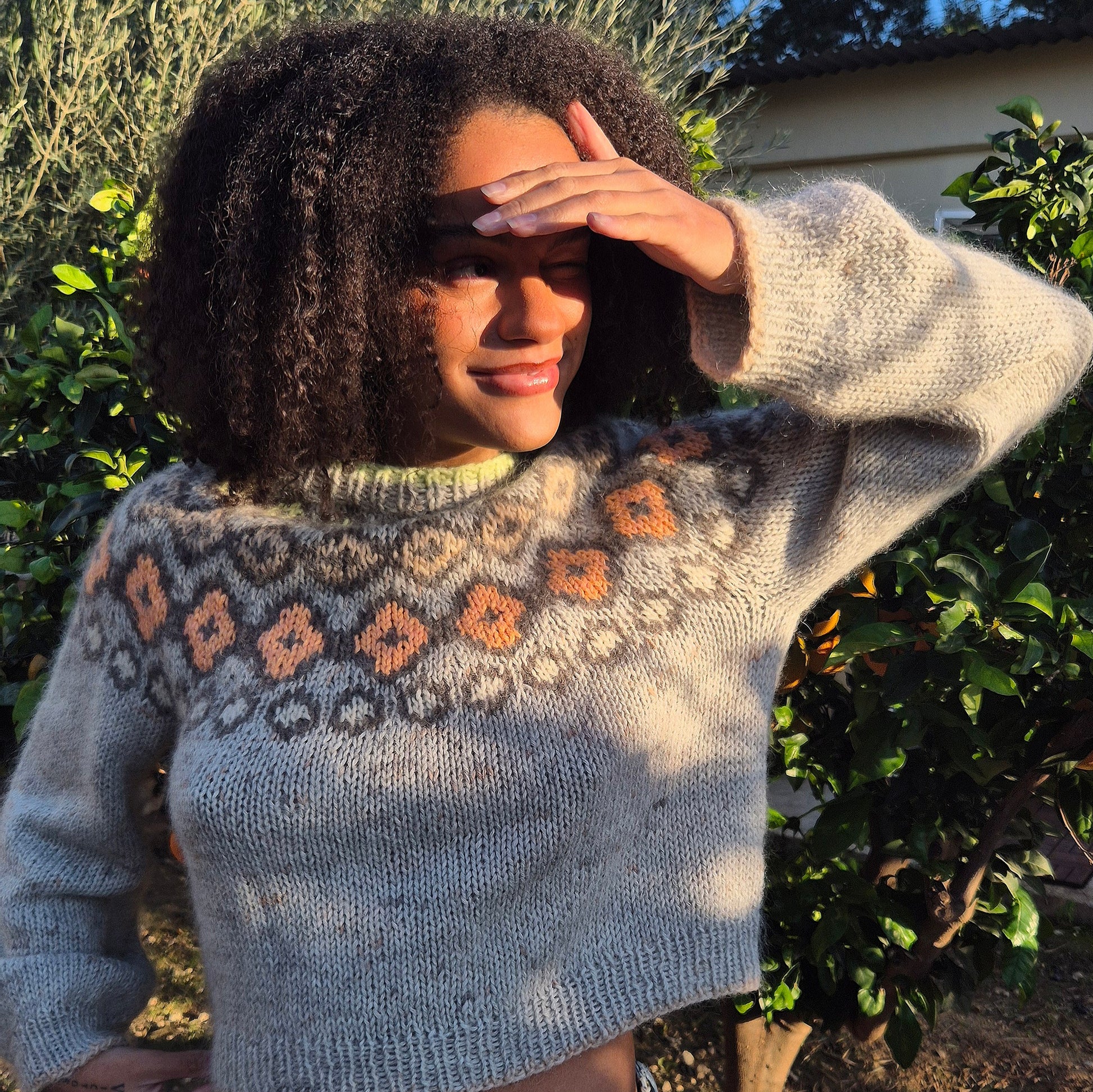 Hier stehen euch viele Möglichkeiten offen. Wir haben den Pullover aus handgefärbter Wolle in Fingering-Qualität mit einem Faden Mohair als Beilaufgarn gestrickt. Dadurch erhaltet ihr ein luftiges, leichtes Strickbild. Dickere Merinowolle, mit oder ohne Mohair, eignet sich genauso gut, dann wird der Pullover weniger luftig und wärmer.